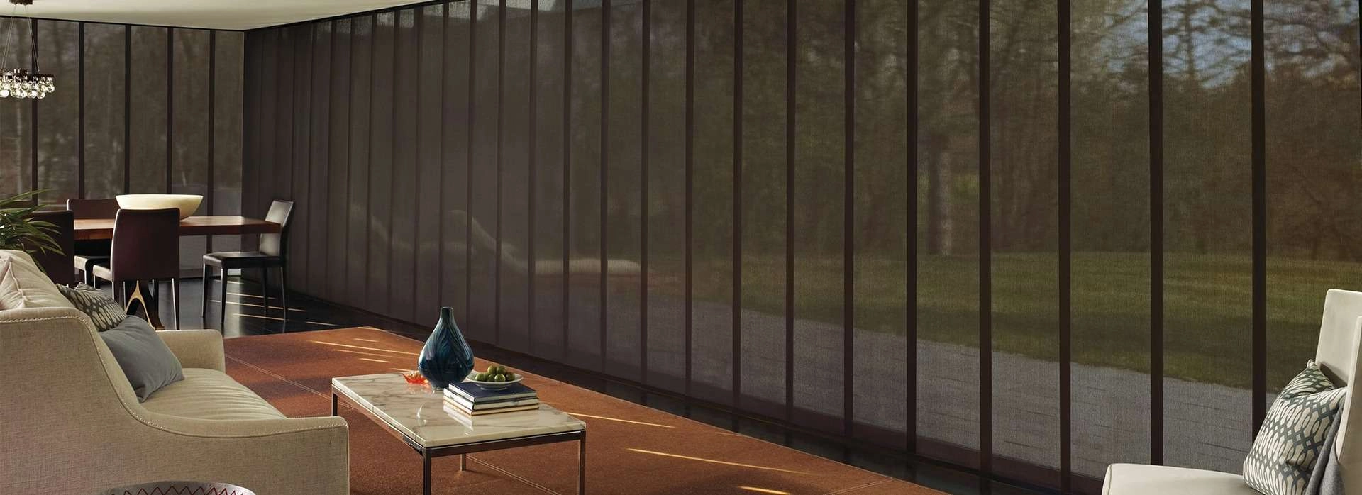 The crisp, chic lines of Skyline® Gliding Window Panels call to mind a luxurious city loft, adding a touch of high-end modern fashion to your patio door. These are more than just window treatments that provide light control and privacy – they’re statement pieces that look as good closed as they do stacked back for full access to your door. With over 600 colors and many textures and opacities to choose from, these window treatments allow you to have full control over the statement you want to make. You can add as many panels as you want to the proprietary slim headrail. This lets you always achieve the coverage and the view-through you need, whether you’re covering a simple patio door or a whole wall of glass.